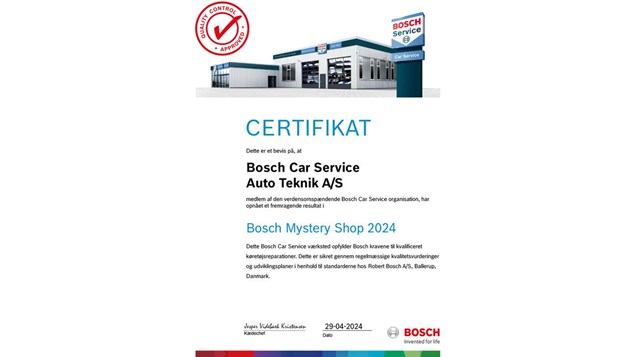 Vi er stolte over at kunne fortælle, at vi er blevet tildelt et kvalitetscertifikat fra Bosch Dette viser, at vi har det rigtige fokus på kvalitet, og at vi leverer den bedste service til dig. PS: Vi har åbent hele sommeren, så skal din bil til service, reparation eller måske have et ferietjek, så er vi klar hos Auto Teknik!