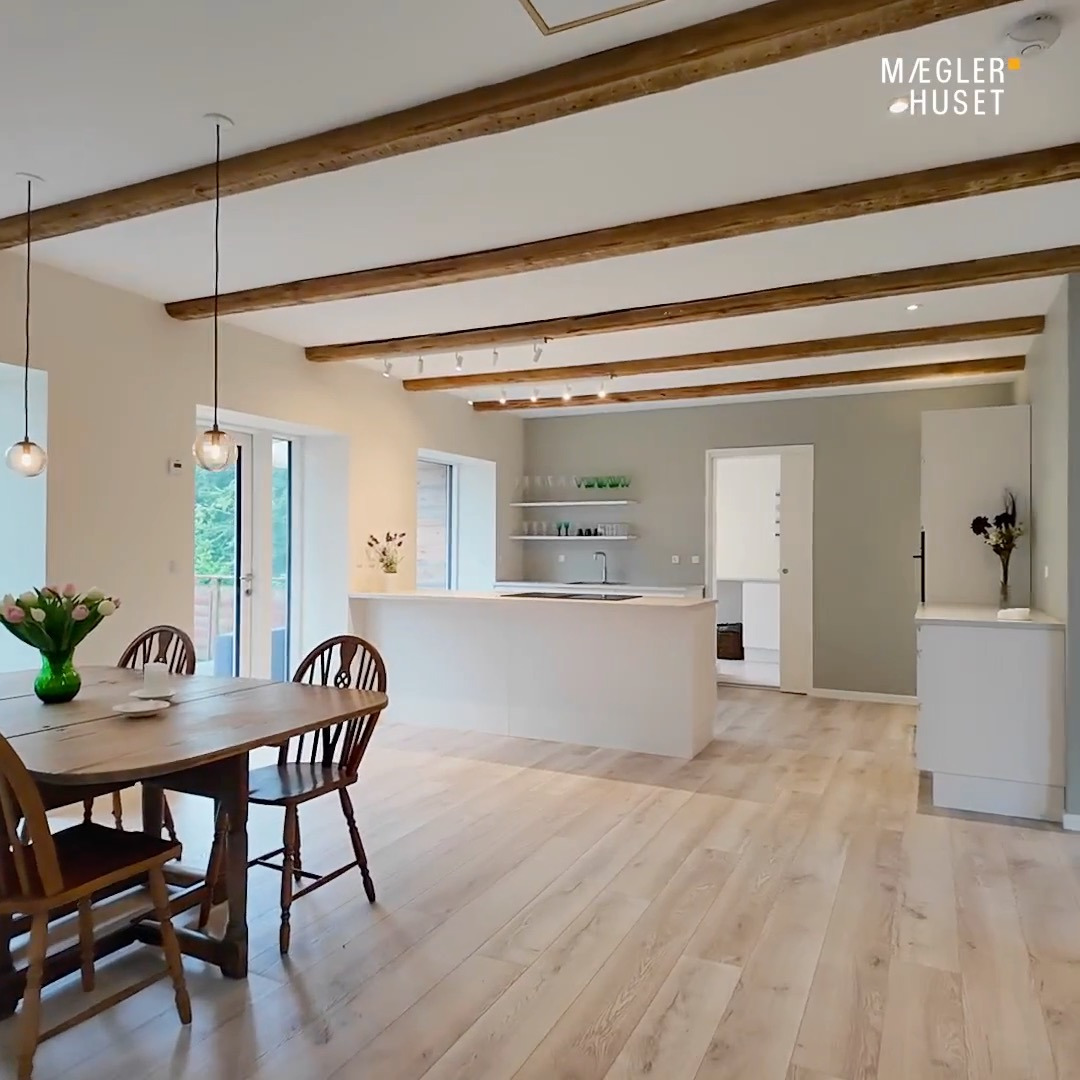 Glæd dig til en lejlighed i nordisk stil med synlige bjælker, lyst køkkenalrum og direkte udgang til privat tagterrasse med udsigt over naturen. Her bliver du en del af et unikt fællesskab med frodigt orangeri, store grønne arealer og et væld af fællesfaciliteter – alt sammen i naturskønne rammer tæt på Voerså og Præstbro.