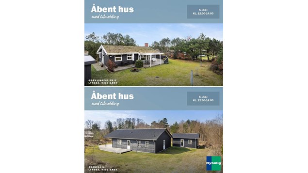 Kom til åbent hus med tilmelding lørdag den 5. juli 2025 kl. 12:00–14:00, hvor vi viser to skønne fritidshuse frem i dejlige Lyngså: