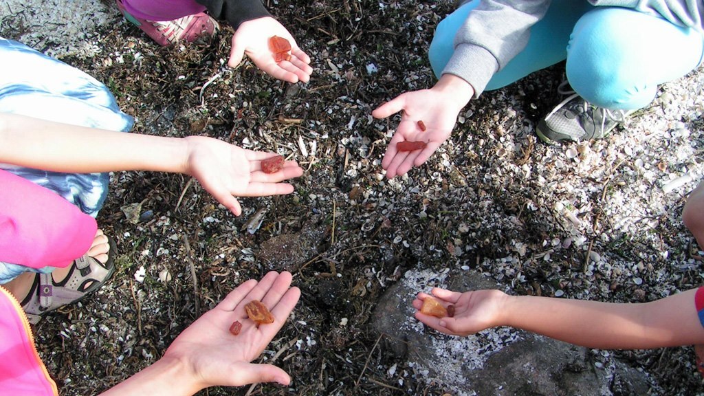 Først får du en kort forklaring om hvordan man finder rav, så går turen til stranden, og alle børn er heldige og finde et stykke, der er stort nok til at slibe.