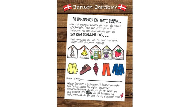Skattejagten efter den frække høtyvs tøj fortsætter hele sommeren - bare spørg efter et skattekort i jordbærboden og aflever det i postkassen ved høtyven